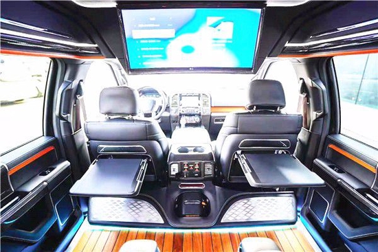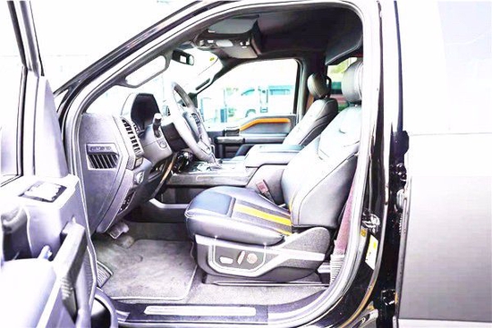 福特F150猛禽改装六座SUV内饰方面,配备标准独特的皮革和布艺装饰的座椅,驾驶员侧的电动十向调节,同时具备记忆功能,中央控制区搭配了触控式显示屏,其下方则是多媒体控制区及空调面板,采用旋钮+物理按键的组合。中控功能区域可分为三个小控制区,最上端为音响控制及导航控制,中间为收音机调节控制,最低端为空调及座椅加热控制。