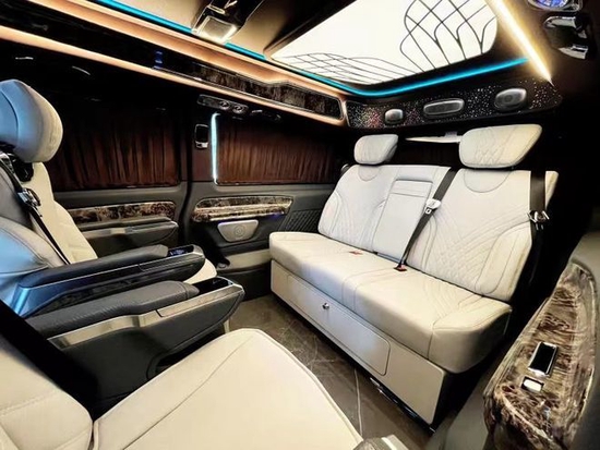 全新奔驰威霆2+2+3座椅陈列,也是商务车最为流行的座椅布局,第二排航空座椅,打孔真皮处置更透气,座椅透风、推拿赐与您更温馨的乘坐感触,更有360度扭转功用;奔驰威霆7座商务车无论是家庭出游照顾孩子、陪家人谈天,亦或是商务洽谈,都能让您随心所欲。在奔驰威霆主副驾驶座椅后方安装有手动小桌板,可承重10公斤,文娱影音配备齐全,24寸高清固定式液晶电视,需求时可随时开启,配合进口丹拿音响,这就是传说中的移动家庭影院,最主要的内饰就是座椅。在改装后奔驰奔驰威霆车顶设计上也富有层次感,灯光采用碎钻搭配,使整车内部空间氛围温馨且大气,而且在造型上也是亮点突出,三款时钟搭配,无时无刻都在彰显奔驰威霆改装商务车高顶版的豪华非凡。