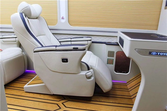 丰田考斯特全新配备高档意大利真皮航空座椅,并配置了电动脚托、电动靠背。让乘客享受头等舱般的享受。航空座椅前配备了真皮办公桌,桌面配以多媒体数据转换接盒,实现多功能的移动办公与会议展示,华通丰业丰田考斯特在车头设计上为了能使车身更加美观更加尊贵,改装之时在车身增加了镀铬的设计,车身中部增加彩线,追求时尚给人以尊贵之感。