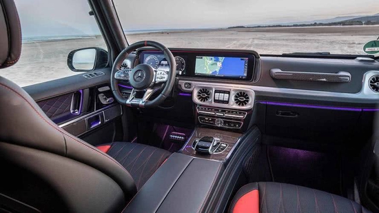 21款奔驰G63豪华精致的真皮包覆提供了足够的舒适性和支撑性,通风和加热功能让乘客免受高温和寒冷的煎熬多处均采用碳纤维材料覆盖,带彩色TFT显示屏的AMG仪表盘、AMG主菜单和单独的挡位显示器以及采用白色照明的AMG门槛。