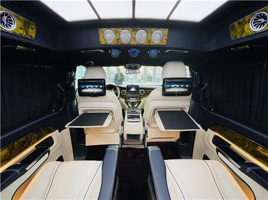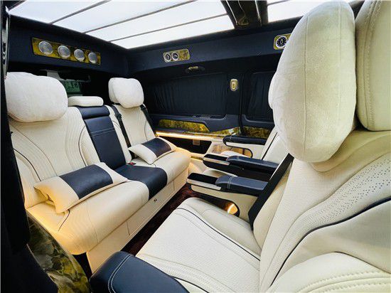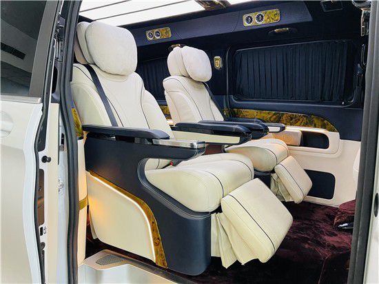 21款奔驰V260L改装商务车第二排航空座椅为带电动、加热、按摩、通风功能的航空级首长席,可沿着地面上滑轨实现一键电动式前后滑动,对于这种智能化的乘坐体验,是原厂车型笨拙的手动拖拽模式所望尘莫及的。车内的氛围灯打开后,奔驰V260内舱变得灵活多变,气氛也可以根据主灯颜色变换而变化,主要的乘坐座椅配置的独立的按摩功能,通风加热,一体腿托,功能丰富,乘坐舒适,是商务接待用车的代步良品。