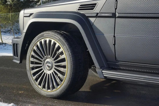 除了全碳车身,这台敞篷大“G”轮毂也经过了MANSORY迈莎锐重新设计,多种尺寸、纹理、材质的锻造轮毂可供车主选择,配上独特的碳纤维悬浮轮毂盖和金色轮圈,一种卓尔不群的精奢霸气跃然于表。