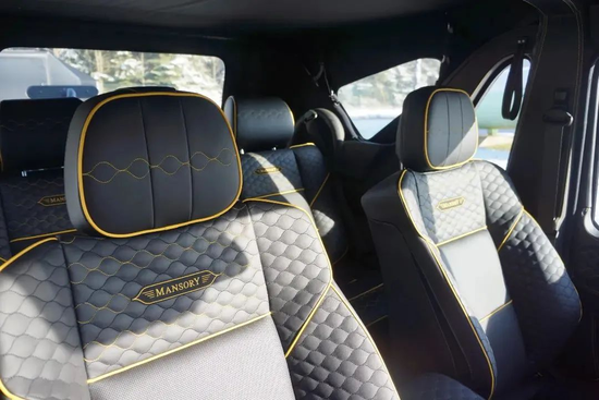 MANSORY SPERANZA 1of1内饰采用全黑真皮包覆,并搭配黄色滚边点缀。多处饰板也采用与外观同样规格的棋盘格纹理锻造碳纤维,看起来个性十足。
