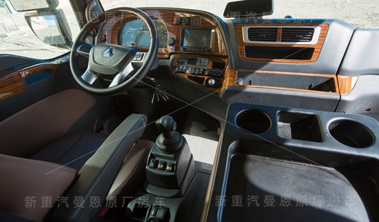 驾驶舱继承了德国MAN风格,主副驾驶位标配气悬座椅,四点悬浮技术能让舒适性更进一步,行车方面标配多功能方向盘、4路监控系统、辅助驾驶等功能;驾驶舱后有一个小的通仓门,打开后即可跟后舱连通。
