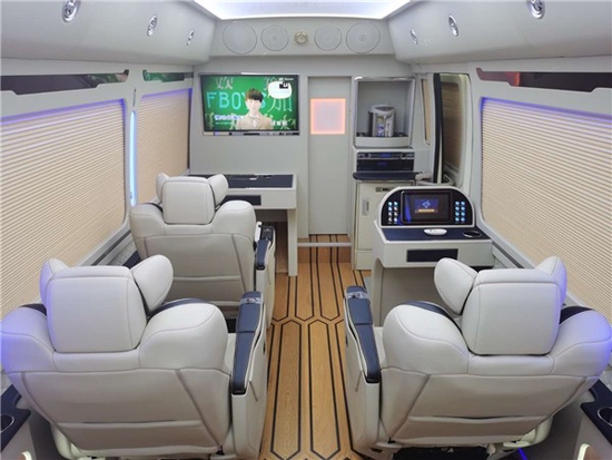 丰田考斯特12座高端改装商务车更加注重商务旅行中办公的实用性。真皮航空座椅,电动调节装置可以让您自行调节最舒适的空间距离以及靠背以及脚托的角度,特殊的座椅构造,增加腰部的支撑,宽敞的空间让您的双腿收放自如,忘却旅途的紧迫感,体验如家般的感觉,缓解您在行车旅途中的疲劳。豪华高档办公桌以桃木及真皮为材料,打造最舒适高端使用的办公环境。