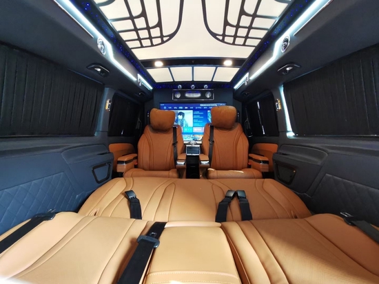 内饰通过改装实现了满足商务接待、洽谈、出游等各种出行需求。全车真皮包覆质感十足。然后它的第二排的座椅也达到了飞机头等舱的标准,手感细腻的进口纯手工真皮包裹,配有精致缜密的缝线,细节之处随处可见。不仅看上去更有档次感,而且在您坐上去之后就能感觉到它完美的衬托感!还具有多向电动调节等功能!它不仅可以让乘客更好的休息,也还可以和后排的人一起下棋或者打麻将,因为这个座椅可以旋转到后方,这样就可以轻松的娱乐了,座椅具备了通风和加热、按摩、记忆功能,整车配置强大,说不出一个不好的理由。