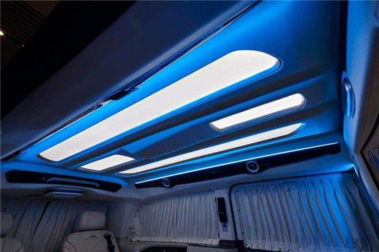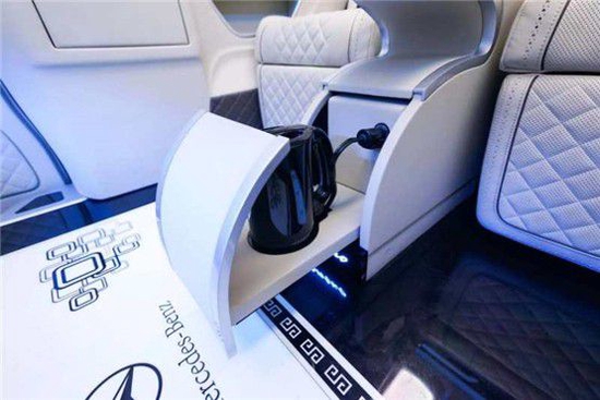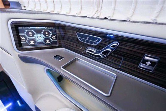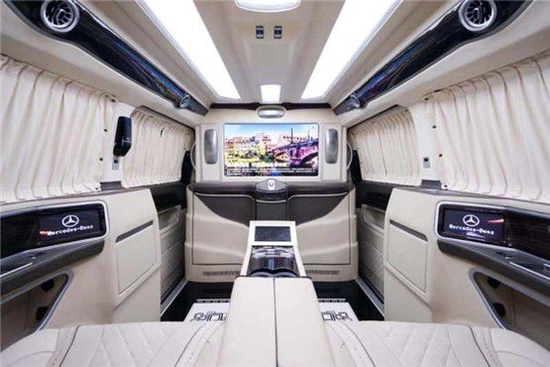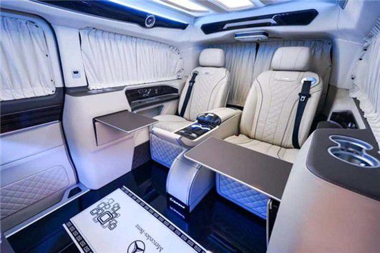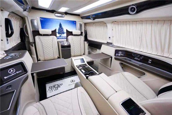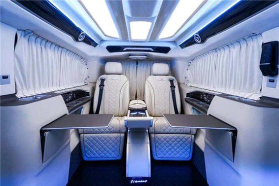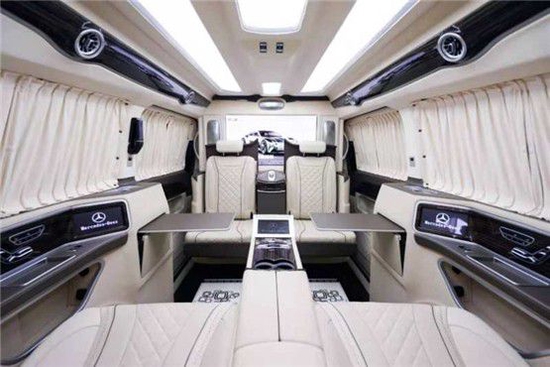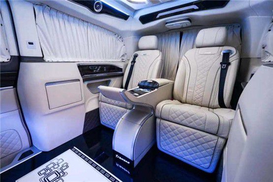 奔驰迈巴赫隐藏六座商务车的内饰当然也是精益求精,豪华属性一直都是奔驰的代名词,进入驾驶舱,驾驶舱中控台采用镶嵌包裹;悬浮液晶导航显示屏,附待360度全车影像.真皮包裹的多功能方向盘,另外正副驾驶座椅全部采用真皮包裹.搭配韩国进口扶手冰箱最低零下18°主副驾驶也附带调节功能如通风加热腰部支撑等.看上去非常简约.操作起来却很优雅,后舱呢也是付有滴水的柱灯 以及整车Napa真皮包覆 座椅真皮包覆包括整车搭配隐藏窗帘为了更好地商务座谈以及车内的私密性 一台高端的商务就应该应有具有