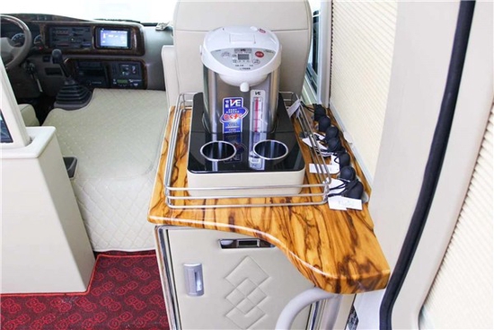 丰田 考斯特 改装 商务车 在内饰的其它的设备上,也充分体现了改装的独特之处。华通丰业 丰田 考斯特 改装 商务车 内饰的灯光,地毯,窗帘,办公桌, 车载冰箱 ,雨伞柜,酒柜,迎宾标志,车内驾驶席的半桃木装饰既能够提高 丰田 考斯特 改装 商务车 内饰的美观,也为人们在乘车过程中提供了更加舒适和实用的办公环境。