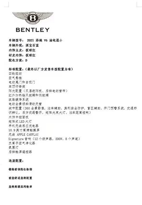 21款宾利添越动力系统部分,新款宾利添越延续了现款车型动力总成,包括分别搭载4.0T双涡轮增压V8发动机、6.0T双涡轮增压W12发动机以及3.0TV6发动机与电动机所组成的插电混合动力系统。其中4.0T双涡轮增压V8发动机最大功率404kW(550马力),峰值扭矩770Nm。传动部分,匹配8速变速箱。