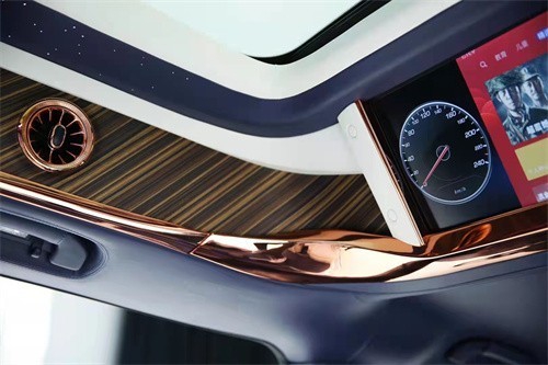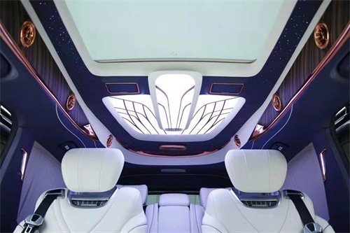 车顶是迈巴赫车顶设计,车等的前方是有个天窗,贵宾舱和驾驶舱是有一个液晶电视作为隔屏,电视是可以升降的,联系电话:18812637416刘经理 (同号微信)液晶电视下方有两个隐藏座椅的设计,左座椅是打开效果,右座椅是隐藏效果。 整车(黑色区域)是用真皮包括,天窗和九宫格灯箱展示效果