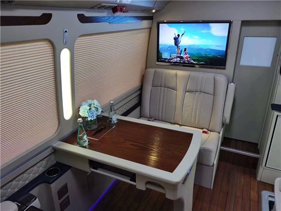卓越的舒适体验 电动台阶、尾翼及倒车监视系统,全方位保证顾客的驾驶人员乃至行人的安全做出保障。除此以外为了方便领导远程移动办公,车内可搭载传真机、车载电脑,无线WIFI等办公设备。