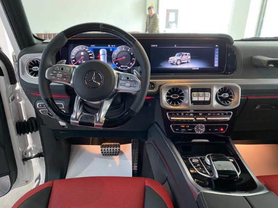 20款全新G63内饰方面,新G63保留了新G500的整体设计,除配色差异外,新车还换装了全新造型的平底式AMG运动方向盘,其两侧配以打孔皮质包裹,下部镀铬装饰的造型也与新G 500明显不同,看上去十分战斗。此外,全液晶仪表盘+中控大屏的双12.3英寸屏幕设计在新车上也没有缺席,营造出了浓郁的科技感。