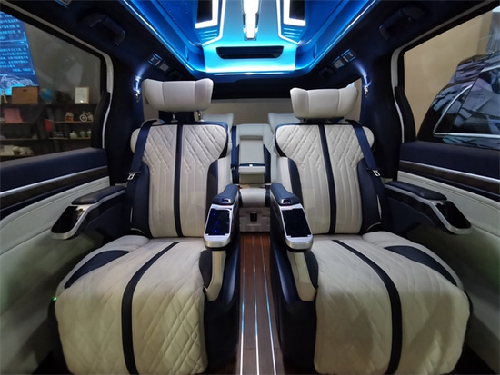 流线型高顶车内头部空间增加了11.5公分,使得车内空间更加宽阔舒适。顶棚采用极夜之光造型顶灯,搭配七彩满天星星空顶,真的是特别好看,入门处即有传祺专属定制的不锈钢脚踏板,以及手工铺垫的进口柚木地板,贵宾舱内饰采用时尚的蓝白双拼配色加高亮光定制装饰,NAPA工艺包覆加上桃木点缀,更加的有质感,顶棚也是采用了高级麂皮绒包覆。对于用材用料上,真是一点不手软啊,这手感必须点赞啊。