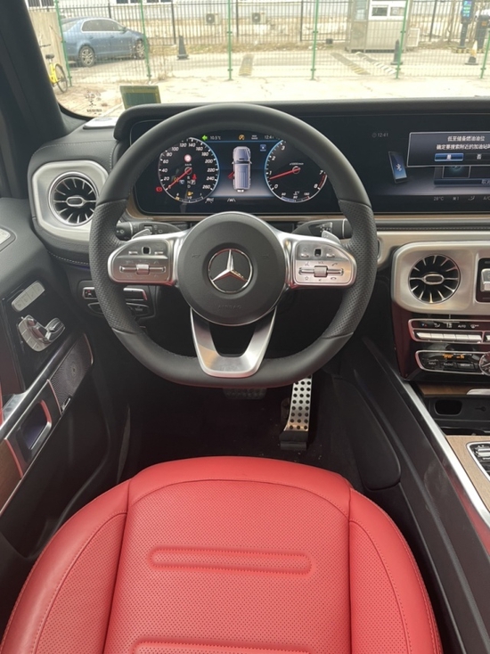 21款墨版奔驰G500 (配置|询价) 月光蓝/红配置:全红Nappa全真皮、红色安全带、20寸多辐轮,4.0T,V8,9速,天窗,前排真皮座椅通风加热,后座椅加热,全液晶仪表,LED日行灯,64色氛围灯,自动空调,柏林之声音响,三把差速锁,前后电眼,雷达测距,并道辅助,脚踏,后视镜电动折叠,多功能方向盘(蓝牙,定速巡航,换挡拨片)20寸AMG合金多幅轮毂。