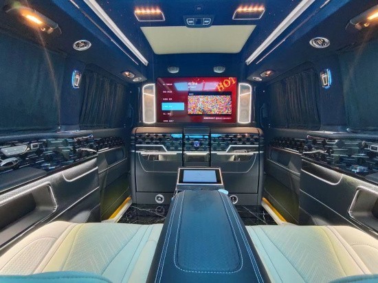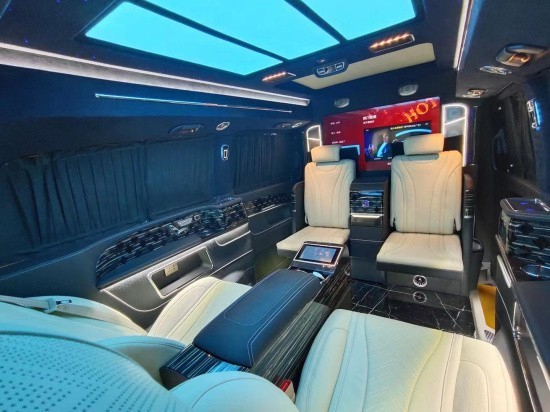 奔驰V(配置|询价)260L高顶四座内饰豪华升级版店内现车。上海圣辉汽车推出多款奔驰V260 (配置|询价)改装升级版车型供大家选择。2022款奔驰V260L高顶系福建奔驰授权改装,有四座跟七座之分,一般四座版设计为隔断风格,七座为通舱设计。22款奔驰V260L我店大量现车,进店购车送保险,今天给大家介绍一台四座版。