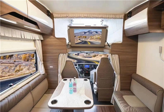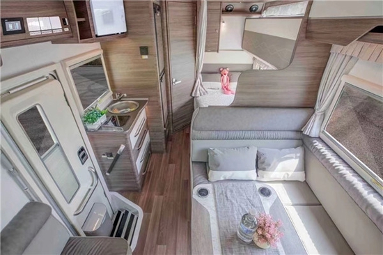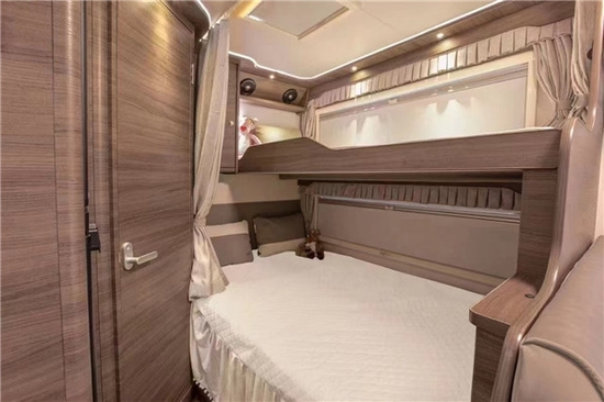 会客厅采用了L型环绕式座椅布局,且所有的座椅均采用双拼色高档皮革包裹和奔驰商务车缝线、褶皱工艺,提升了整车的质感。座椅采用高回弹海绵填充,支撑性和舒适性都是上佳的表现,保证了长途旅行的舒适性。也可以转换成一张尺寸为1.2×1.5(米)的儿童床。