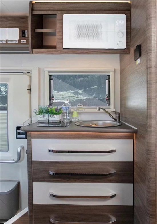 厨房区域功能齐备,厨房区配备电磁炉、盖板洗菜盆、冷热水龙头、低噪水泵一氧化碳报警器、可燃气体探测器等,上方及下方还配有储物空间便于存放日常食材,右侧是两台英德尔76L冰箱共计152L,满足冷冻冷藏的需求。