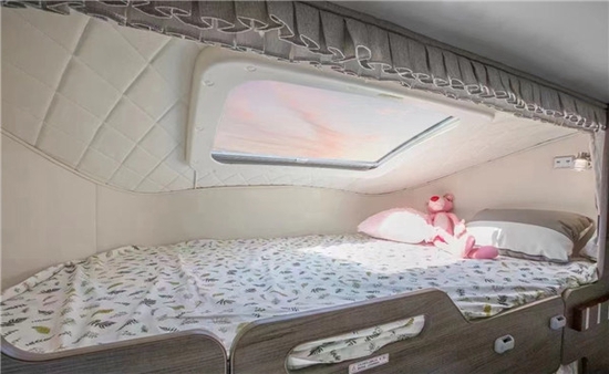 后纵置子母床这个床位形式目前一直是用户高频选择的布局之一,宾歌CX500在该位置的设计依然可圈可点。这款车顶部单人床的尺寸为1900×750(mm),下铺尺寸为1900×1150(mm),天花板上配备的窗帘完全可以保护上下铺用户的隐私。