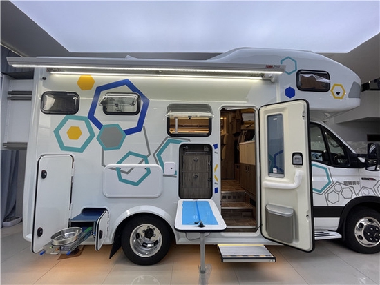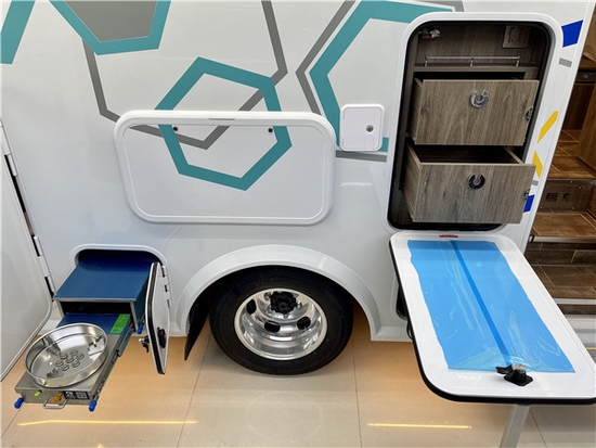 车身两侧分别配有意大利进口菲亚玛遮阳棚、户外抽拉式防风燃气灶、户外厨具储物柜、水电接口等。房车底部标配进口电动驻车支腿,剪型的交叉驻车支腿带有自动调平功能,让您在车辆驻车的过程中更安全稳定。后舱贯通式的储物舱,保证了我们极大的储物空间,折叠自行车,折叠电动车,户外桌椅以及我们旅行的装备都放在这里,给了您充足的储物空间。