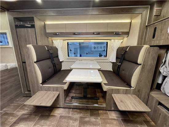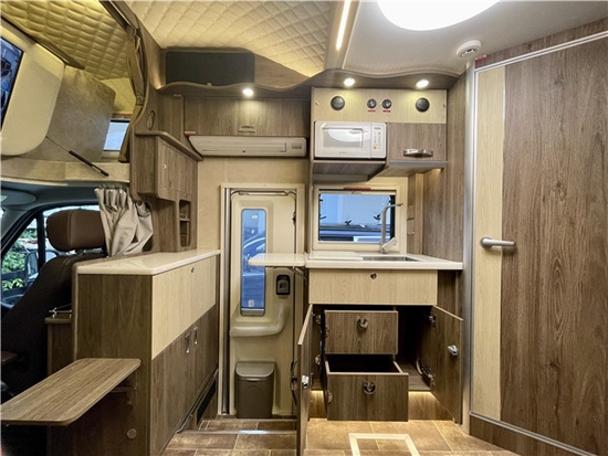 车内部分采用中式的家居风格,更符合中国人的审美,会客区采用双人对坐卡座设计,可以向外侧拓展开来,将餐桌向下可与卡座拼接变为一张1900*945(mm)的沙发床。上方设计有一组吊柜,可以放置一些物品,配合我们尾部储物仓让我们整车的储物空间达到惊人的2500L;左侧拓展出去以后中间有了一块非常宽敞的空间。内饰采用了棕色木纹加米色木纹的装饰,沉稳内敛十分讨喜。BirdVX: 1 8 0 1 7 7 5 1 1 8 5