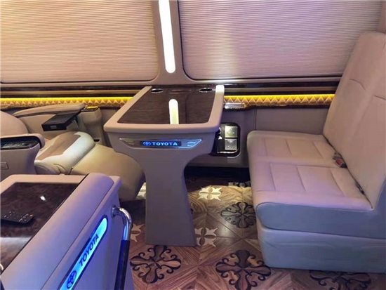 丰田考斯特的外观设计上更加符合传统的中国审美元素,米黄金色的车身设计增加高贵的色彩。高大的车身也显示出端庄和大气。丰田考斯特超VIP版及超VIP尊贵版配备全车真皮座椅,舒适的真皮航空座椅配置了座椅通风,座椅加热,座椅旋转,座椅按摩,电动脚托及隐藏式活动桌。华通丰业丰田考斯特改装商务车一般都会将原车简陋的窗帘更换掉,我们可以选择豪华的布艺窗帘或舒适的百叶窗帘,百叶窗帘可以选择是手动的还是自动的,加装窗帘装饰框等,更加贴合顾客的需求。