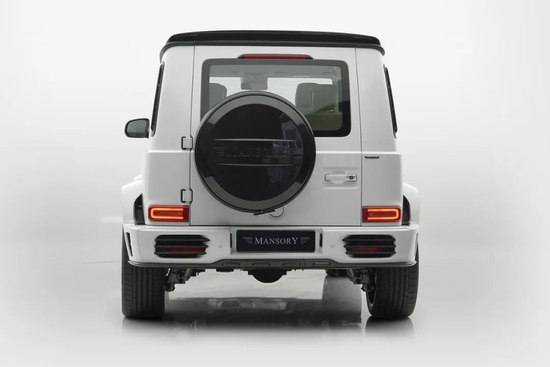 MANSOR此次选取了T200锻造碳为G63打磨出一个宽体包围用于拓宽前脸;量身定做的全碳引擎盖质感非凡;原本三横幅镀铬进气格栅重新设计成了直瀑式,中央内嵌的三叉星辉logo也用MANSORY官方碳纤维车标加以替代。其余部位诸如:前唇、前/后保险杠、LED示廓灯罩、车顶探照灯、后视镜盖等部位也都以碳纤维打磨而成的空力组件做了替换升级,对比原厂GClass更显典雅大气。