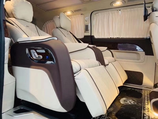 19款奔商务版驰迈巴赫VS680后排座椅柔软舒适、支撑足,坐姿可调幅度非常大,能够让乘客半躺姿势乘坐在后排,腿托加分,对比同级别车型,这个后排必须满分。科技感十足,并且加入前、后排手机无线充电功能及头等舱级后排独立座椅。后排座椅支持180度电动放平迈巴赫VS680顶部分采用成本相当高的Alcantara包覆,并且保留了可开启的天窗和后部的迈巴赫九宫格顶灯,那用理性的决定选择迈巴赫V级就体现在它的个性化功能上。