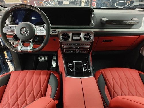 图片中的G63单选瓷器蓝外观颜色,整车单选配置:暗夜包:黑曜石黑前大灯 前转向灯 后尾灯 防撞杠 前护板 侧后视镜 备用轮胎圈 格栅青铜灰色 前保护罩黑色 座椅舒适包:主动式多轮廓前按摩座椅 前座椅快速加热 前座椅通风 独家内饰包:座椅 门板纳帕皮菱形格座椅配钻石缝线 仪表板上下真皮包裹对比色缝线 主动式多轮廓前按摩座椅 前座椅快速加热 前座椅通风 纳帕皮包边丝绒 地毯脚垫 行李箱垫子 AMG 碳纤维方向盘 AMG GT方向盘按钮22轮AMG 碳纤维内饰。