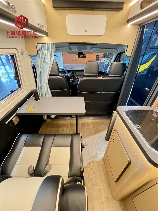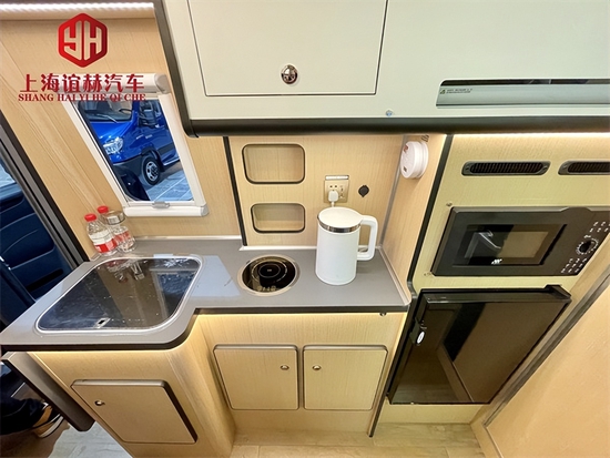 双人会客区为连排双人座椅,对于乘坐舒适感来说是有提升的,座椅面略微上扬,当乘客落座的时候身体有一定的后仰,一定程度上能坐的更安稳一些,不容易滑下来。座椅底座距离地板的边缘最大间距为1000mm,充分保证了乘客腿部空间,甚至可以将腿伸直,半躺状态都可以。厨房区位于会客区后方,能在B型房车内拥有功能齐全完备的厨房使用功能实属不易。不仅厨房区拥有不锈钢洗菜池、电磁炉、储物柜,在厨房的一侧还配有美的微波炉和88L冰箱,可谓麻雀虽小,五脏俱全。如果觉得操作台太小,在一侧还贴心配有延伸,增加操作台面积并且在不用的时候还不占空间。