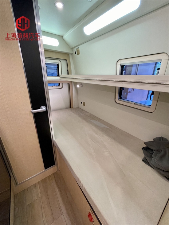 这款云游B型房车采用的是后纵置上下铺的基础布局,整车核载5人,最大可以满足2人居住。依维柯欧胜厢式货车是下宽上窄的厢体,所以来到车内,尤其是改装成房车之后,顶部空间收窄比较明显,对于头顶的储物吊柜的内容积影响是比较大的。通过测量内部地板距离车顶最大净高度为1850mm,按照工信部新规(车内高度不低于1750mm),完全满足用户在车内直立行走的需要。驾驶室上方通过板材的嵌套,内部是车内比较大的储物空间,个人感觉内部光线较暗,完全可以增加一个触控LED灯,方便用户拿取东西。