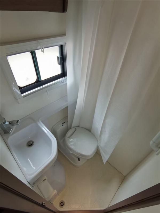 卫生间一体成型,采用SMC航空级板材,杜绝发霉漏水等情况发生,30年免维护,配有塞特福德可旋转马桶,排气扇,储物格,花洒,洗手盆一系列沐浴用品一应俱全,车辆净水箱是180L,灰水箱45L,灰色箱18L,日常用水能正常满足。