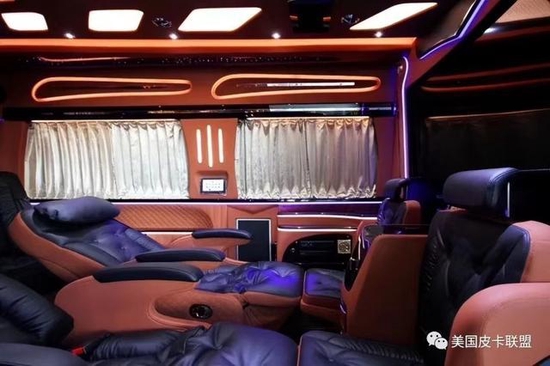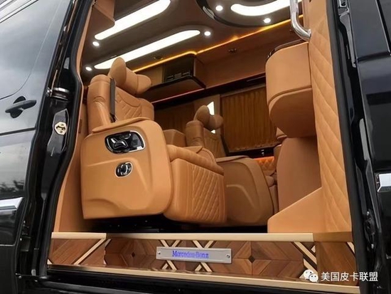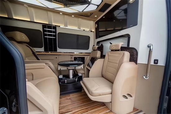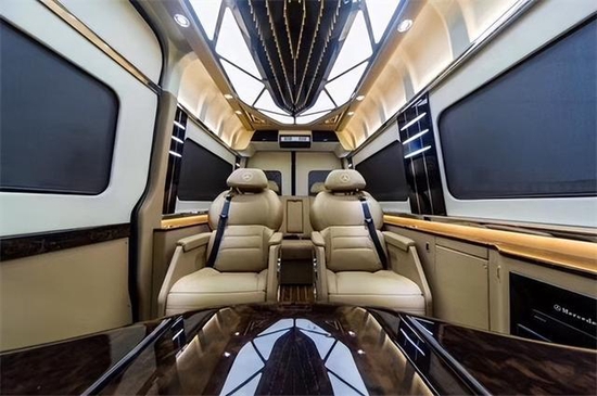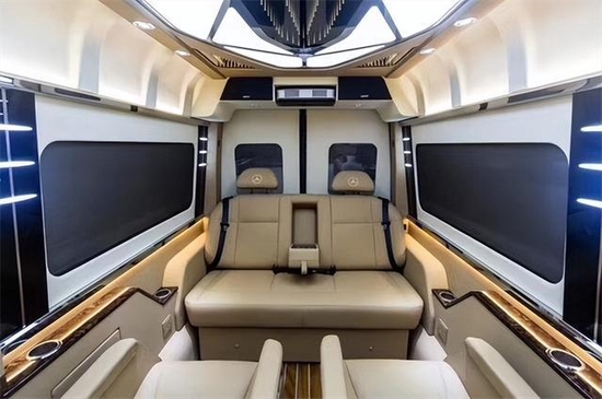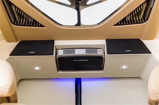 奔驰斯宾特改装后带有电动窗帘,娱乐音影系统,以及顶灯的造型都是与众不同;在奔驰斯宾特顶部周边的出风口都是分散式出风,不会直接对人吹,而且整车每一个套件每一个板块都是开模制作,精细化工艺,每个层面都做到了最完美的衔接,每一款奔驰斯宾特都彰显着车主一往直前的精神和对美好生活的诠释。