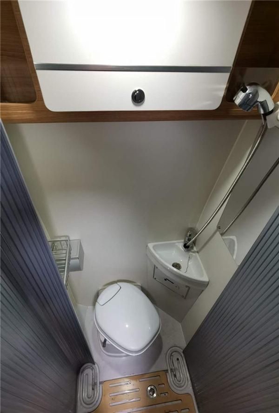 一体式卫浴间内部面积为800×940mm,内部配置了房车专用旋转坐便器、洗漱池、浴镜、独立淋浴花洒、换气扇、储物柜、储物格、毛巾架等多种设施;