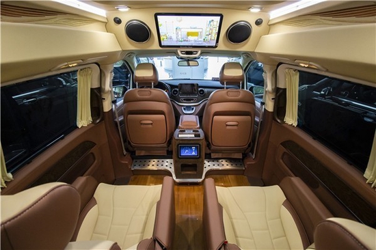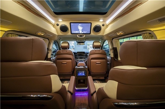 奔驰V260限量版商务车顶部分采用成本相当高的Alcantara包覆,并且保留了可开启的天窗和后部的九宫格顶灯,如果说这种豪华的氛围只是感性上的认知,那用理性的决定选择V级就体现在它的个性化功能上。舒适车厢 - 身心享受,尊贵独有。