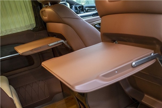 如果说这种豪华的氛围只是感性上的认知,那用理性的决定选择这台VS880商务车就体现在它的个性化功能上。进入第三排我们深刻体验到这一点,第三排的座椅为贯通式设计,材质和舒适度与中排座椅一致,腿部和头部的空间可以用大的夸张来形容,创造出了绝等舒适的享受
