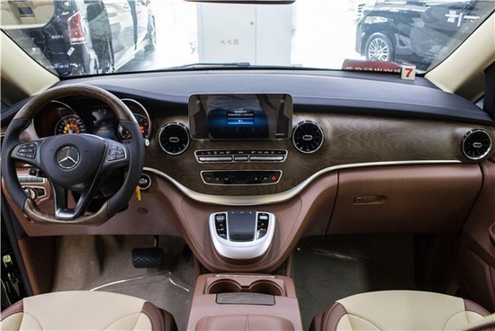 奔驰V260的驾驶室也和其他相同车型有很大的不同,8.4寸中控液晶屏、大量的高光泽钢琴漆装饰面板装饰、Nappa真皮多功能方向盘,操纵感流畅,两个座之间配备了扶手冰箱(可制冷可加热)、TouchPad触控板、全新三幅式方向盘、气氛灯等细节共同打造驾驶舱奢华感。