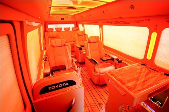 在营造轻松氛围方面,丰田考斯特改装车也有着完备的系统装置。首先,32寸液晶显示器让您在车内任何位置都能畅享影音,放松心情;操控台上的高品质音响可以在需要时让优质音频传遍车厢,让您处于放松且安逸的状态;车内多个小音箱,可保证重要消息或集体有效传达或做到更好的效果;CD机,AM,TM等装置能丰富形式。丰田考斯特改装商务车为您的休闲时光增色添彩;乘客舱LED灯,或是紫色的高贵淡雅或是粉色的精致温柔,或是绿色的清新健康或是蓝色的自然休闲,随着你的心情变换颜色,为您量身定制合适舒心的氛围。以舒适的状态打造出美观的环境。丰田考斯特改装商务车的独特和尊贵也成为我们喜欢她的一个重要原因。这些都是丰田考斯特改装车给您准备的惊喜中不起眼的一小部分。