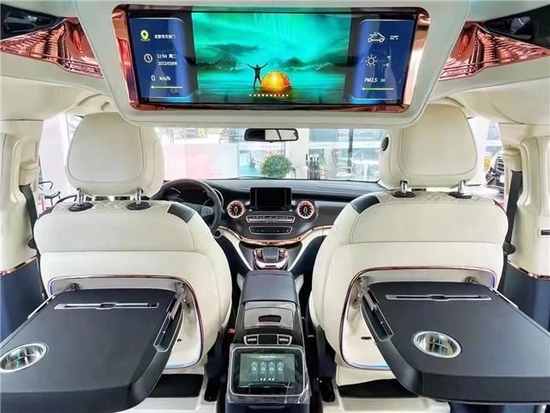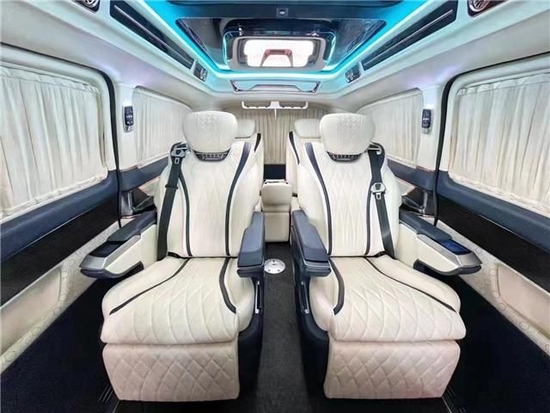 进口奔驰V250商务车内饰方面同样做了整体的升级,中控台、方向盘、门板、车侧壁、车顶、进门的踏步整体升级包覆。正副驾驶座椅升级包覆、正副驾驶座椅中间加装车载扶手冰箱、正副驾驶133座1185椅6676头顶定制宽屏车载网络电视、正副驾驶座椅椅背后方加装可伸缩的小桌板。133-1185-6676