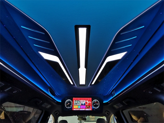流线型高顶车内头部空间增加了11.5公分,使得车内空间更加宽阔舒适。顶棚采用极夜之光造型顶灯,搭配七彩满天星星空顶,真的是特别好看,入门处即有传祺专属定制的不锈钢脚踏板,以及手工铺垫的进口柚木地板,贵宾舱内饰采用时尚的蓝白双拼配色加高亮光定制装饰,NAPA工艺包覆加上桃木点缀,更加的有质感,顶棚也是采用了高级麂皮绒包覆。对于用材用料上,真是一点不手软啊,这手感必须点赞啊。