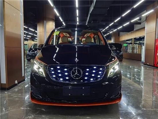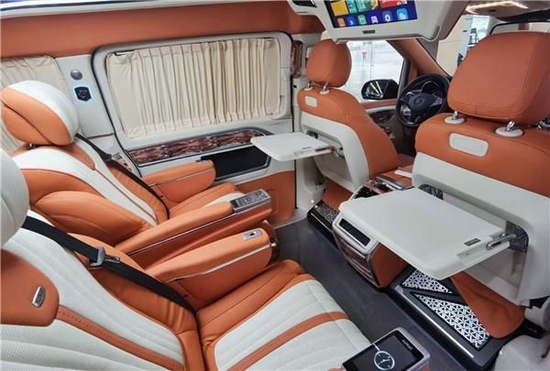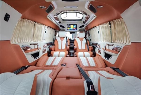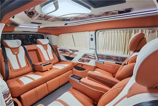 后舱采用两张尖端智能航空座椅,通风加热按摩腿托等功能一应俱全,智能语音控制系统与触摸式控制系统、指纹记忆功能相交结合,最重要的还是配备了重力感应系统,当你坐上去时会给你自动调节。车身内部乘客舱天窗,电动智能化,车身两侧高档对开丝绒窗帘 ,注重隐私安全性。前座背部可折叠桌板,完全可以进行会议办公,可展开电子平板摆放等娱乐休闲模式。全车豪华游艇级内部装备,带给用户体验的就是,游艇级的轻奢享受。