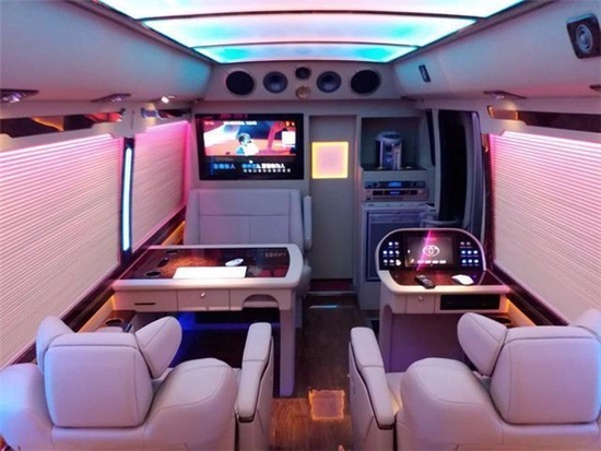 丰田考斯特12座在窗帘以及座椅的改装上注重和内饰风格的完美融合,百褶窗帘搭配上豪华的游艇木地毯,整体的端庄展现出丰田考斯特的大方气质。豪华的布艺窗帘配备上红色的通道地毯,温馨的内饰带给我们更多的与众不同之感。华通丰业丰田考斯特12座在内饰的灯光上增加多种色彩设计,航空顶灯营造出不同的氛围设计,内饰的多样色彩成就了丰田考斯13座的完美舒适。