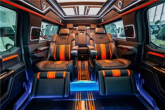 福特勇猛者内饰部分采用的完全是顶级商务车的标准,豪华性以及舒适性都是顶级水准,车体,门板,座椅采用的都是纳帕真皮的软包,舒适度极高,档次也十足,整车做了多重隔音,降噪,防火,保暖等处理。进一步提升了整车的安全性,舒适性。比之商务车也丝毫不逊色因为超大的车身尺寸,所以其空间性比之商务车甚至要更胜一筹。第三排座椅可放平成为沙发床,可满足2人卧躺休息,顶部的全景天窗可以让你尽享野外魅力的星空。