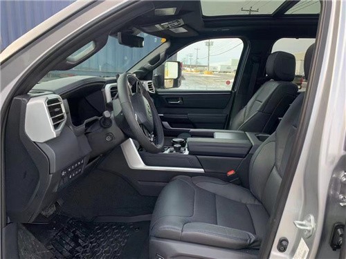 新款丰田坦途3.5TT座椅提供有皮质包裹,整体的造型也非常宽大,在中央扶手区域的设计上也采用了非常方正的造型设计,并且可以看到前排的储物空间设计还是非常丰富的。