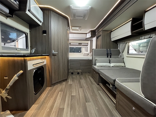 厨房区位于进门处,标配电磁炉、带案板水槽、水龙头,上方储物吊柜,下部厨具收纳柜,配以户外抽拉式炉灶,旅行途中想要的中餐西式皆可以轻松搞定。下方还配有洗衣机,车门处的位置也便于轻松拿取衣物。在厨房一侧配有英德尔152L的冰箱,容量充足,可分区冷藏冷冻食物。尾部休息区为横床设计,尺寸为1900*1250mm,可供两人同时休憩。床铺上方配有一排吊柜,可以收纳日用衣物。