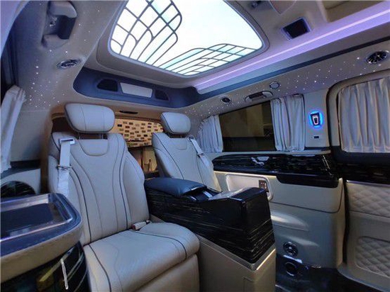 奔驰V260改装版四座商务车第二排则为隐藏式座椅,可根据用车需求一键开合,收起时就会变成豪华吧台,科技感十足!两个奔驰GLS450 (配置|询价)的秘书座椅座椅,可电动语音识别进行收回,展开.