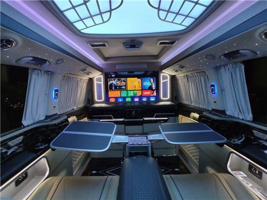 进口VS680采用隔断式吧台,可升降液晶电视,吧台中间镶嵌一块万国表,全车真皮包裹。整台车采用了前后隔断的设计,隐私性稍差空间性更好,便于商务接待的同时兼顾家用,定制风格采用经典的元素,宽大的航空椅配上舒适头枕,坐在上面就想美美睡上一觉。座椅带有8向的电动调节,超长的腿拖和按摩功能。无论出游还是商务会谈都十分凸显逼格儿!