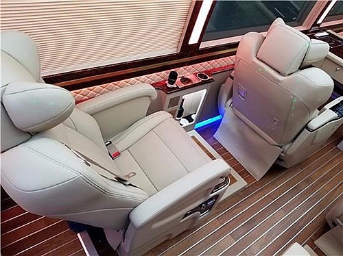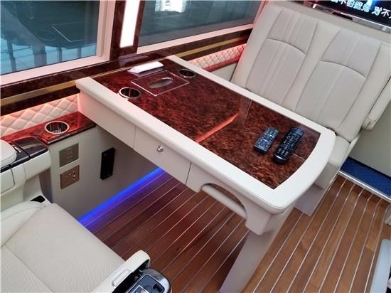 真皮方向盘:半仿桃木半真皮方向盘。木纹外表台:丰田原 3D实景导航系统进口丰田考斯特报价国产考斯特改装奢华客车自动挡H7报价 国产考特改装奢华客车内饰方面:丰田考斯特在车辆的性能、舒适度上具有较大优势。改装后的VIP商务房车其内部装配了舒适的奢华转角沙发,桃木会议桌桃木多功能置物架、通讯设备、新式彩灯以及奢华地毯等物品。