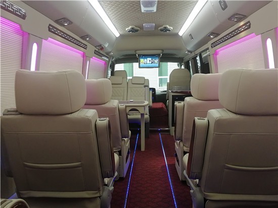 丰田考斯特14座商务车真正能够展现尊贵身份的在内饰的改装上,亲身体验一番才能够领会到尊贵的含义。改装版的14座丰田考斯特从座位的布局上采取了后排座位数为四个,中间三排采用左二右一的的布局,前排为豪华首长席,并且配备办公桌以及固定秘书桌。在上车门的右端安装并向设备,主驾驶后有隔断分离。如此设计,乘车空间宽敞,设计贴心,豪华的办公桌椅带给我们不一样的乘车感觉。