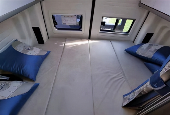 驾驶舱采用多功能的方向盘,中控台配置液晶显示屏,搭配导航倒车影像系统可以更好地提 升行车安全。主副驾驶座椅使用皮革包覆,给驾驶员提供更好的驾驶乘坐感受。同时在驻车时主副驾驶座椅可以旋转与会客区形成对立式卡座,为我们提供更为宽阔的生活区。