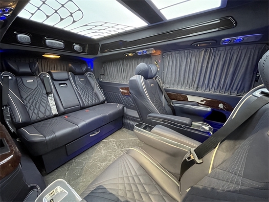 全新奔驰威霆2+2+3座椅陈列,也是商务车最为流行的座椅布局,第二排航空座椅,打孔真皮处置更透气,座椅透风、推拿赐与您更温馨的乘坐感触,更有360度扭转功用;奔驰威霆7座商务车无论是家庭出游照顾孩子、陪家人谈天,亦或是商务洽谈,都能让您随心所欲。在奔驰威霆主副驾驶座椅后方安装有手动小桌板,可承重10公斤,文娱影音配备齐全,24寸高清固定式液晶电视,需求时可随时开启,配合进口丹拿音响,这就是传说中的移动家庭影院,最主要的内饰就是座椅。在改装后奔驰奔驰威霆车顶设计上也富有层次感,灯光采用碎钻搭配,使整车内部空间氛围温馨且大气,而且在造型上也是亮点突出,三款时钟搭配,无时无刻都在彰显奔驰威霆改装商务车高顶版的豪华非凡。